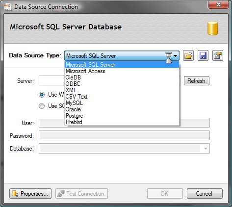 Indigo DQM supports Data from multiple sources and types including Microsoft SQL Server, Microsoft Access, ODBC, OLEDB, MySQL, Oracle, Postgre, Firebird, XML, JSon and CSV.
