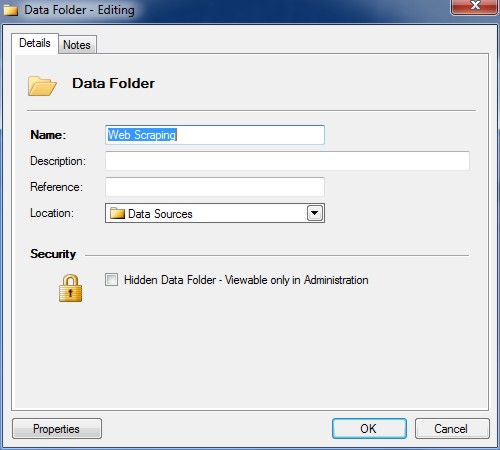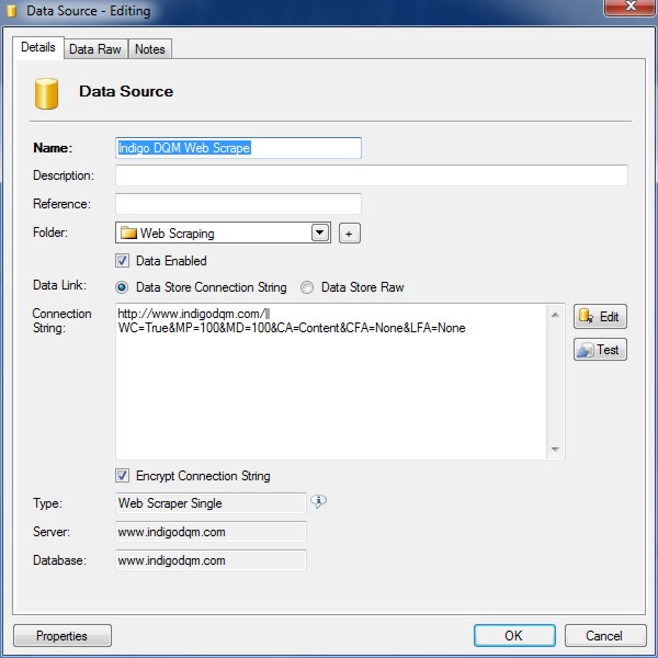 Click the 'Properties' button to configure the advanced settings and options for the Web Scraper / Crawler Data Source.
