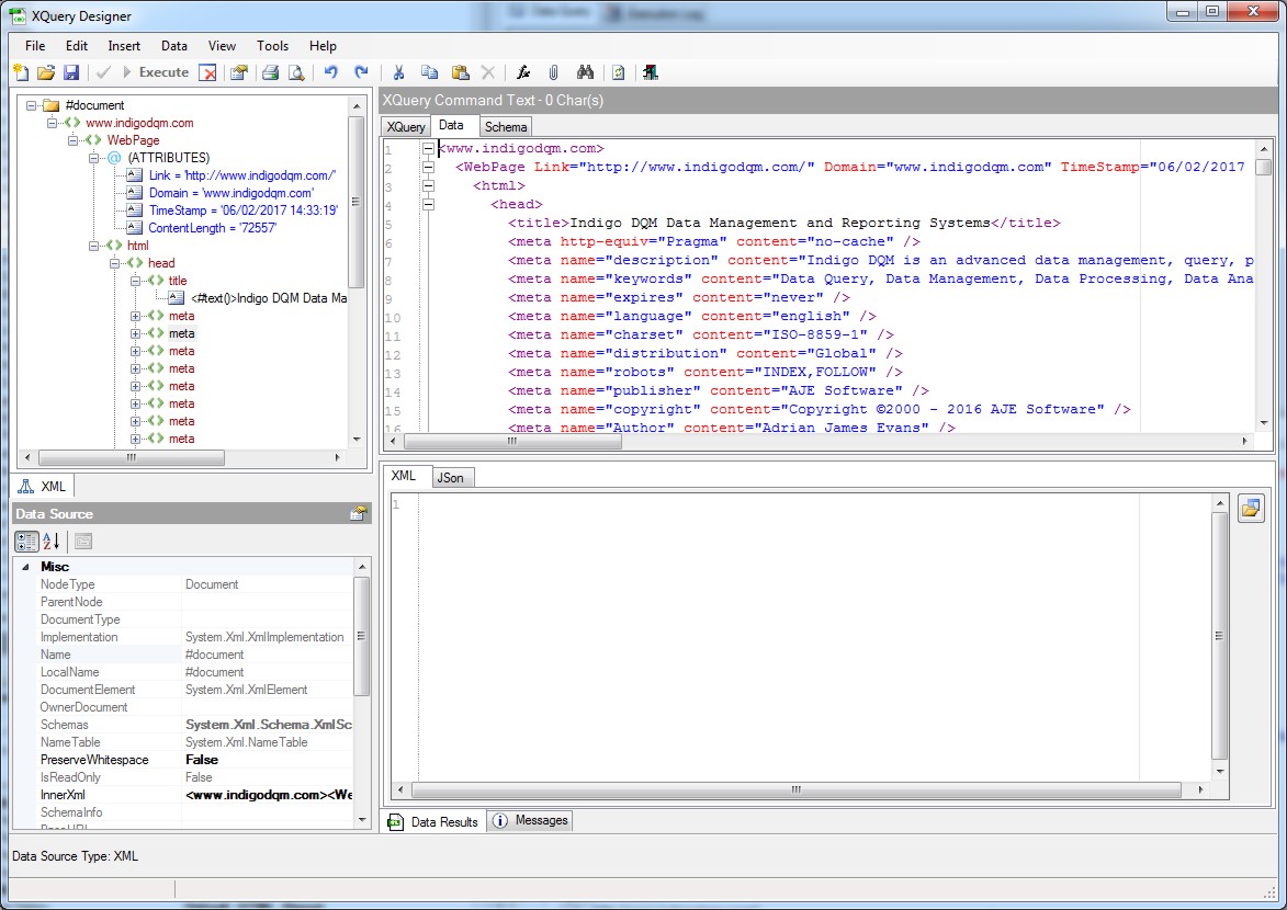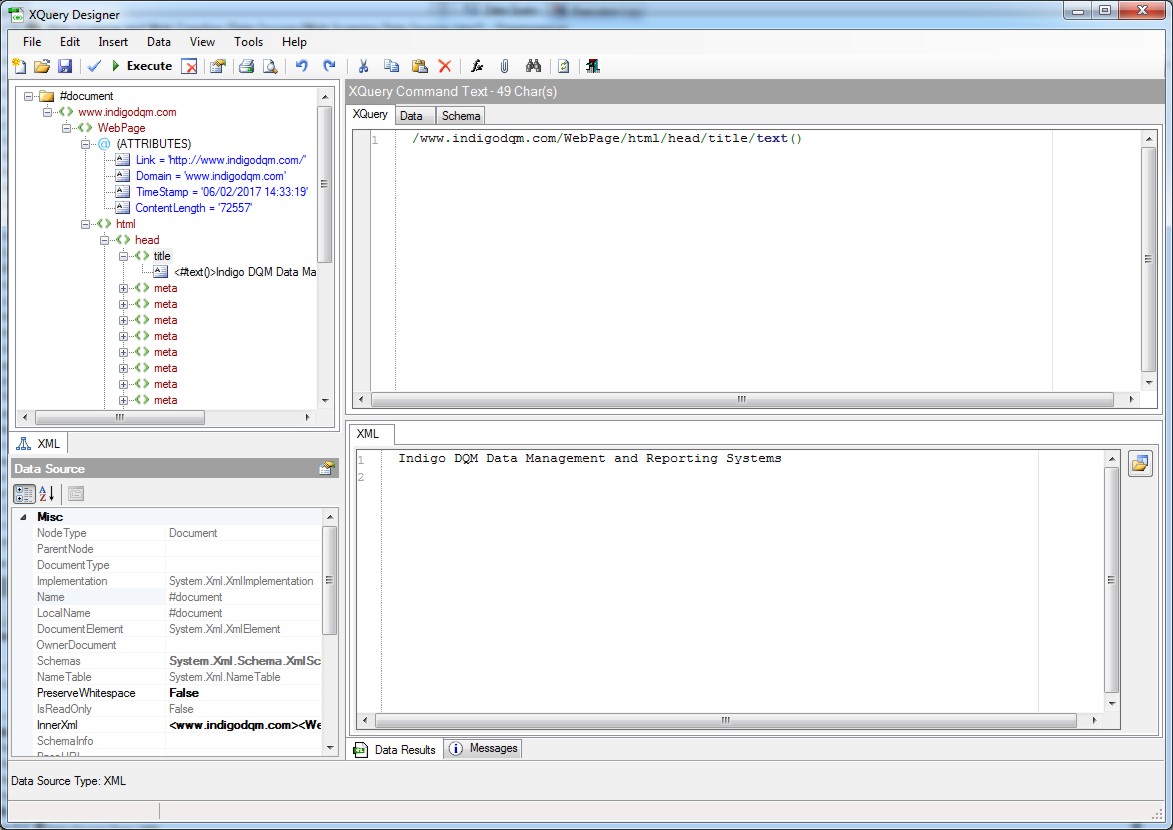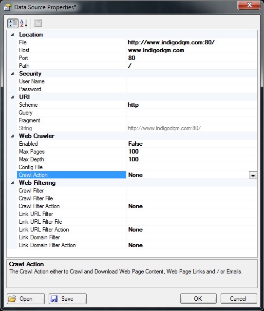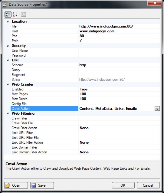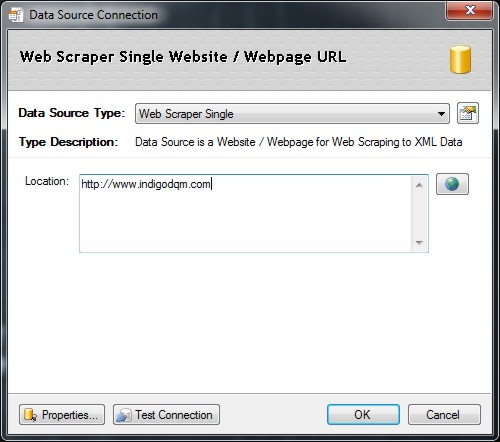 Indigo DQM can harvest a single URL or an entire Websites content using the Web Crawler. XQuery / XPath can used for Data Mining / Scraping extracting information such as products, prices, contacts etc. from a Webpage.