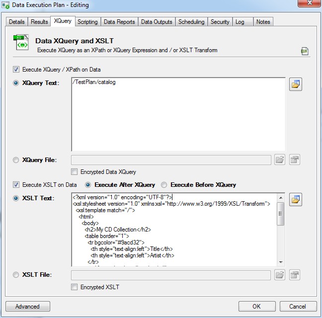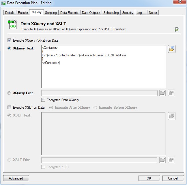 Check the option to enable the XQuery and enter the XQuery / XPath expression to execute on the Data Execution Plan.