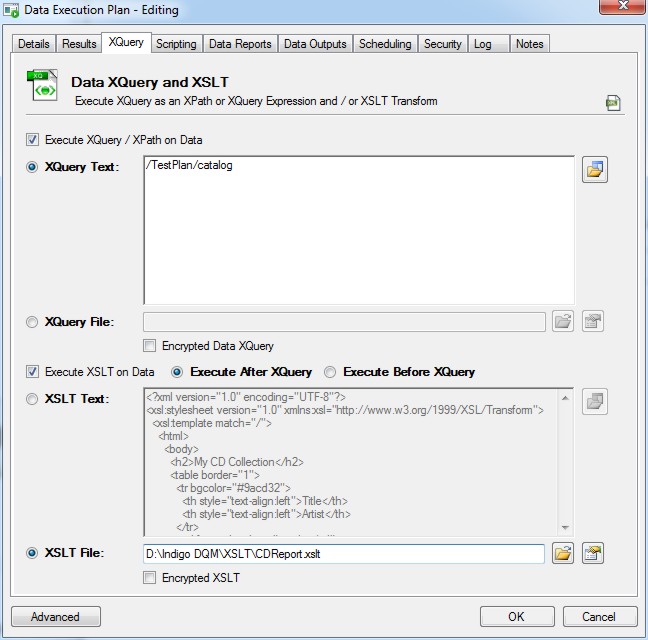 Indigo DQM's Data Management Engine (DME) can execute additional XQuery expressions and / or XSLT transforms on Data Execution Plans if required.