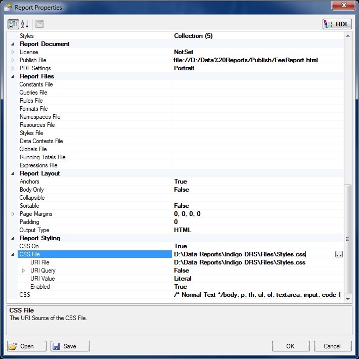 Setting the Report CSS File to define the Cascading Style Sheet in the Report.
