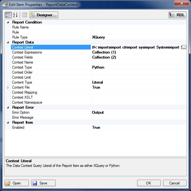To apply a Data Context to a Report element expand the Data Context property or click the (...) property button and specify the Content Type as either a Literal (Constant) or a File.