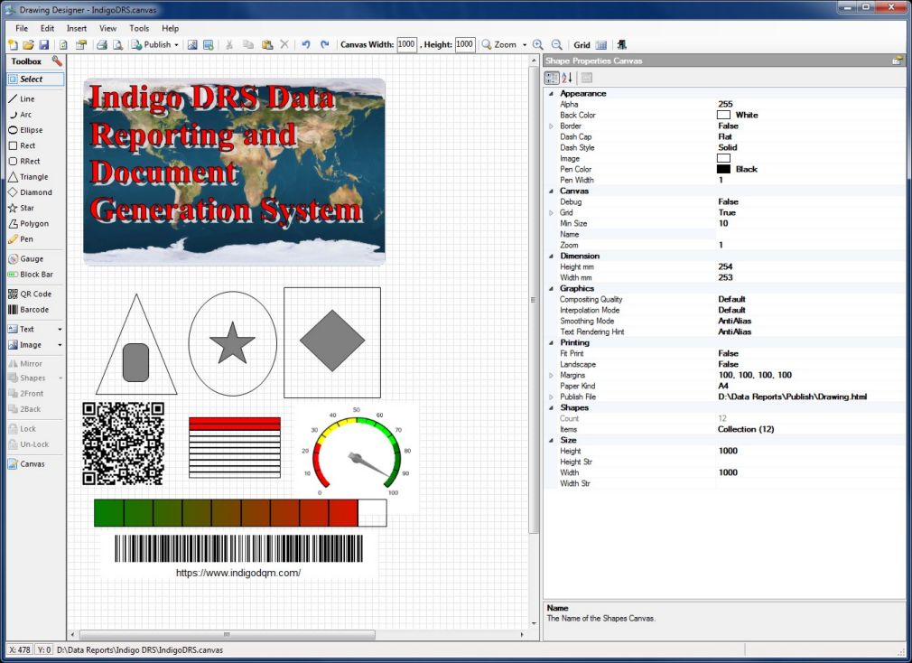 The Drawing Designer contains a toolbox of shapes and objects for creating complex drawings including QR Codes and Barcodes.