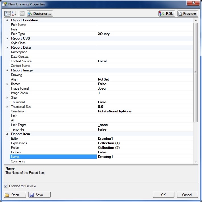 Click the Designer button or the Drawing (...) button on the property page to edit the Report Drawing content.