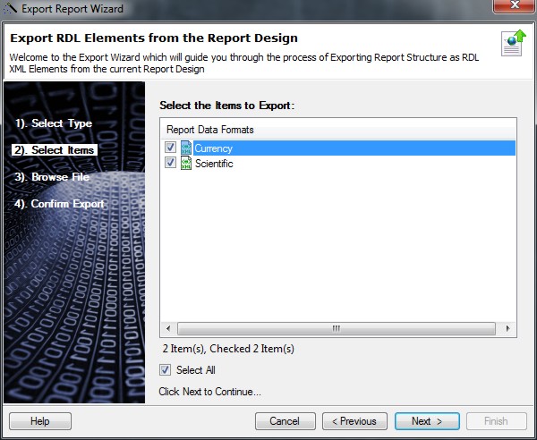 Select the Report RDL elements to export to a Report RDL File by checking the boxes in the list.
