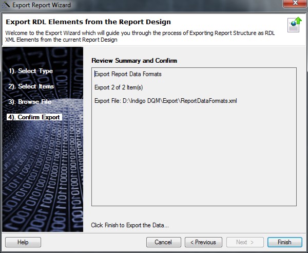 Indigo DRS can export and save Report elements using Indigo DRS RDL (Report Definition Language). Elements can be exported using the Export Wizard or saved from the RDL Editor / Viewer. Exported RDL will be saved with an XML File extension.
