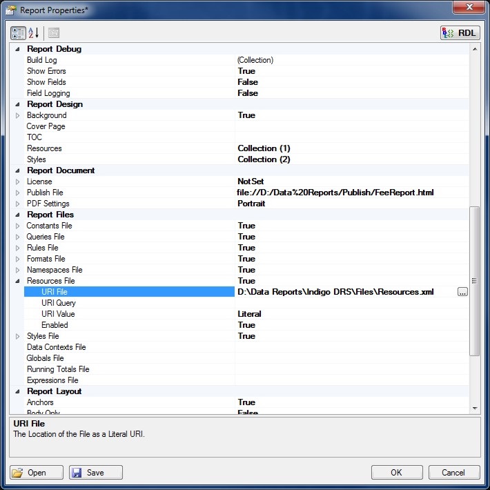 Click the Resources File (...) property button to specify the URI File or URI Query for shared Report Resources.