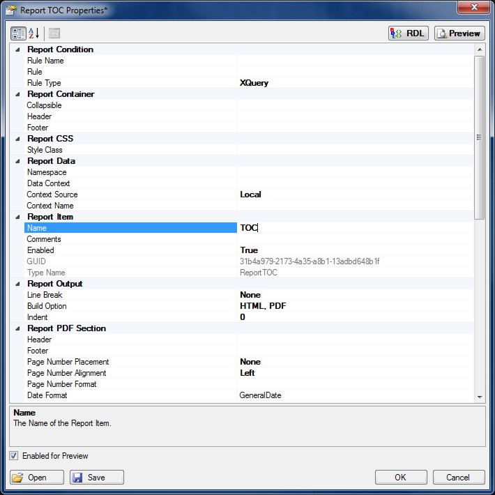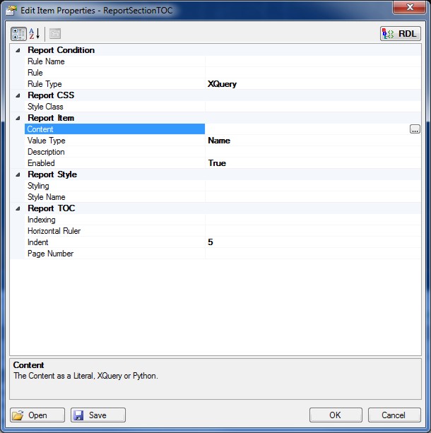 The Report Table of Contents (TOC) uses element names by default but an XQuery or Python statement can also be used to query Report Data and display an alternative output for the Report TOC.