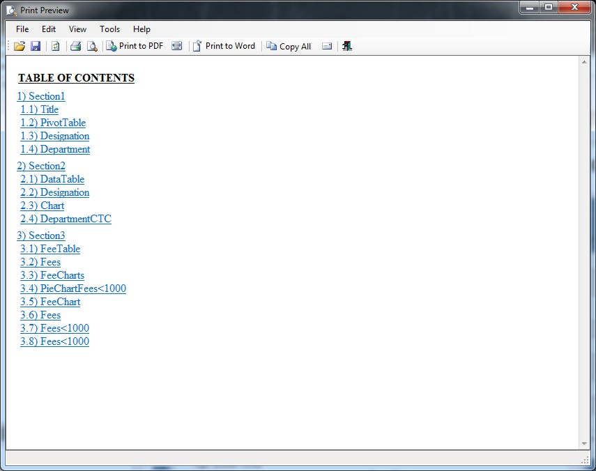 Table of Contents (TOC) are automatically generated from the Report design and structure with options for styling and indexing.