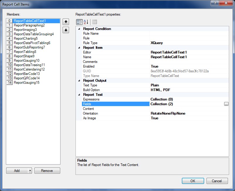 Report Items added to the Report Table Cell can be edited using the property grid in the Collection Editor.
