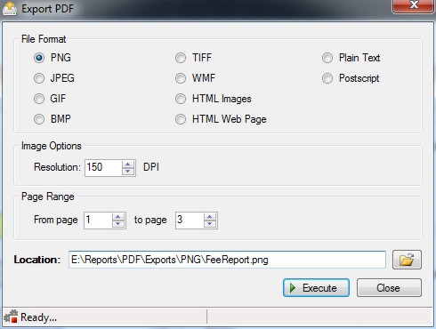 Select the location and file format to export, the resolution and the page range. Click the Execute button to start the export process.