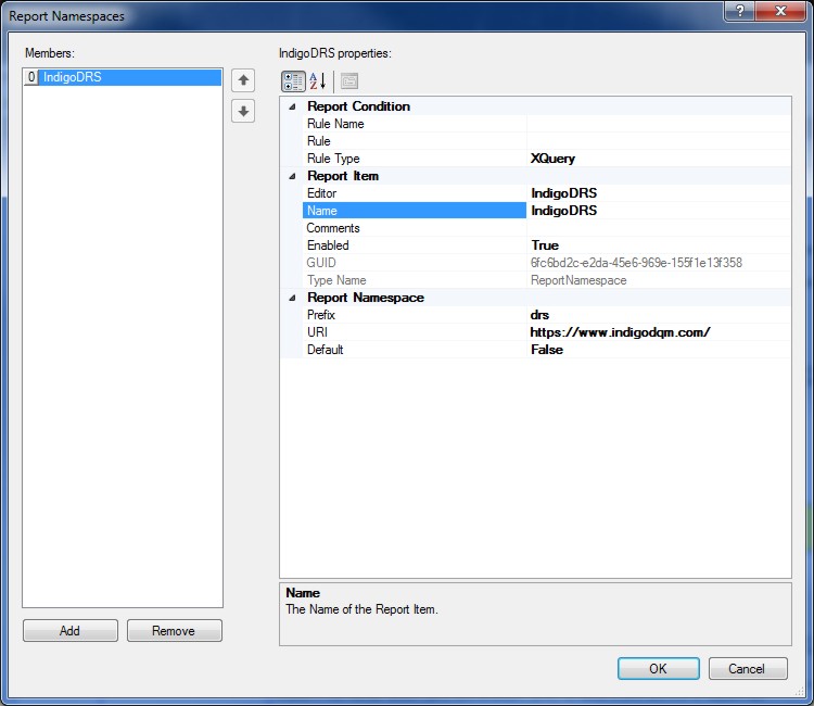 To add or edit Report Namespaces open the Report Namespaces Editor. Add a Report Namespace, Prefix and URI to reflect the namespaces in the XML data.