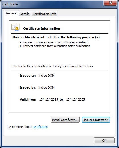 Indigo DQM software uses a self-signed digital signature
