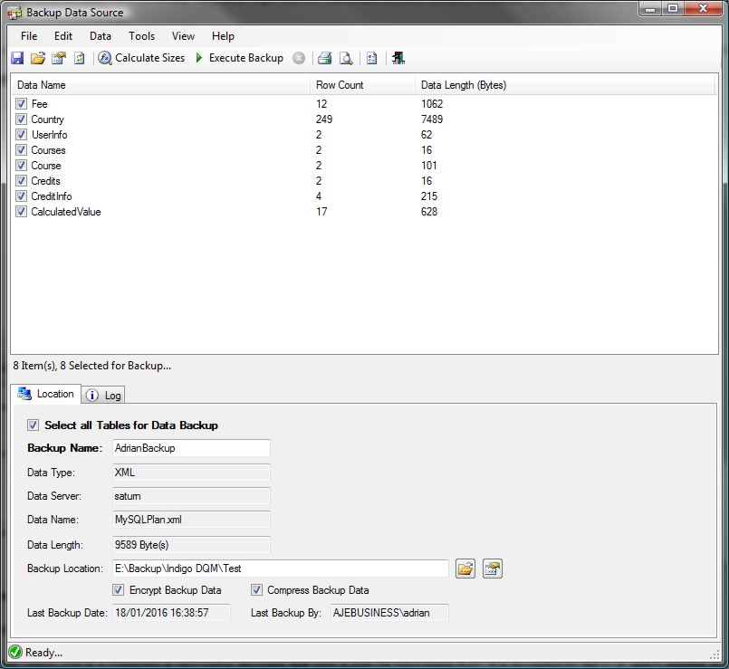 Indigo DQM Backup supports data from multiple different sources and types including Microsoft SQL Server, Microsoft Access, ODBC, OLEDB, MySQL, Oracle, Postgre, Firebird, XML, JSon and CSV.