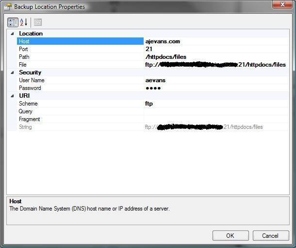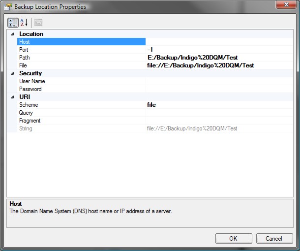 Enter the host, port and path for the URI location of the backup and the security credentials if required.