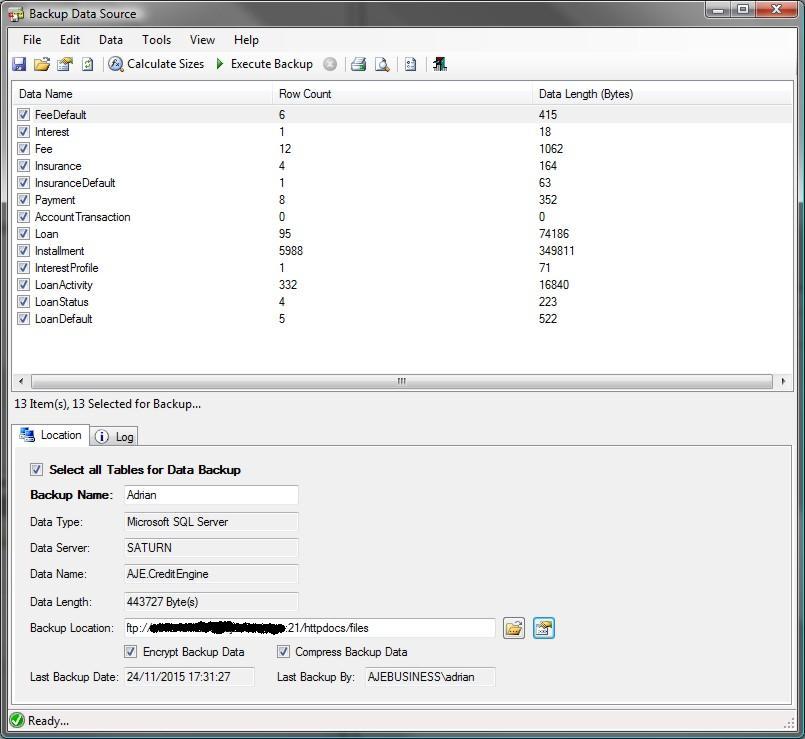 Select the item(s) from the list for the Data Backup. Enter the details for the Backup Package and the location to Backup Package. Click the 'Execute' button to start the Backup process.