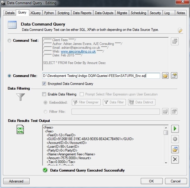 The Data Command Query can be encrypted for added security using the Advanced Encryption Standard (AES) with a 256-bit encryption key. Check the option and the Data Command will be encrypted in the Data Asset Store. If the option is enabled for the Command File then the Command File must be encrypted by the Encryption Tool. You can save a Data Command Query from the Query Designer and use the Encryption Tool to encrypt the Command File.