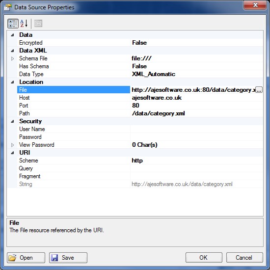 The URI properties of the Data Source allow parameters to be defined for Host, User Name and Password if required.