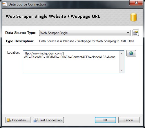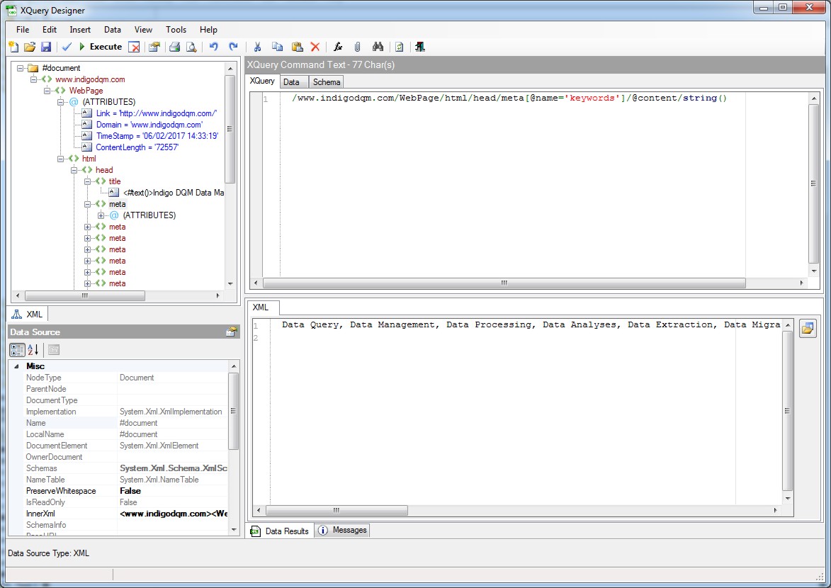 Indigo DQM can harvest a single URL or an entire Websites content using the Web Crawler. XQuery / XPath can used for Data Mining / Scraping extracting information such as products, prices, contacts etc. from a Webpage.