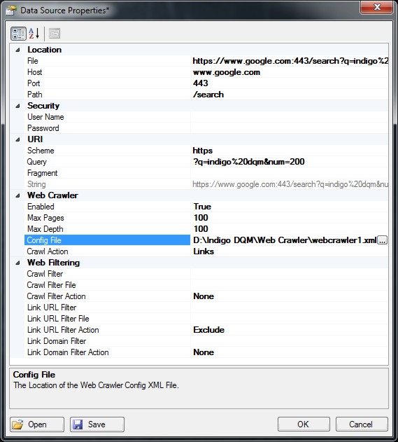 The Web Crawler can be configured using an XML File. Copy the example below to a directory and point the Web Crawler Config File in the Data Scraper to the new File. Change the parameters in the Config File as required.