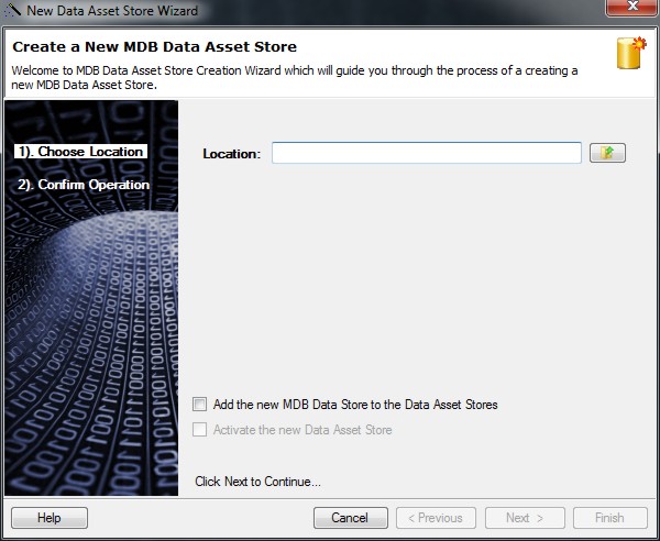 To create a new MDB Data Asset Store select the option from the Data Management Studio Tools menu and then follow the instructions in the Data Asset Store Wizard.