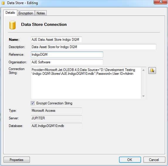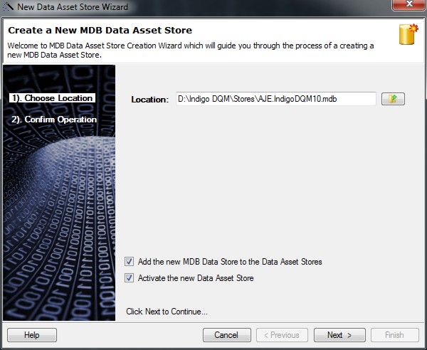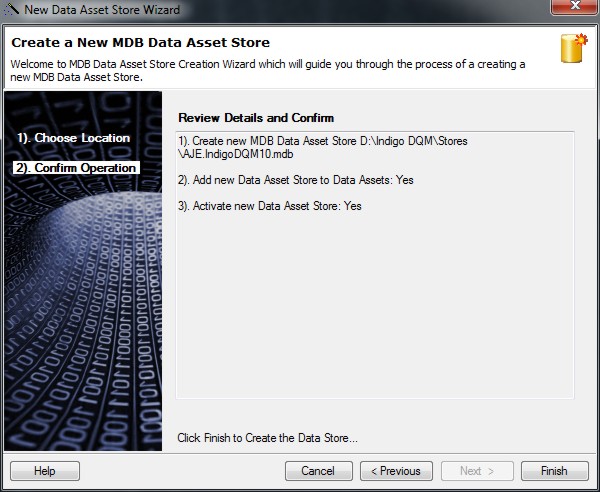 Indigo DQM includes a utility to dynamically create a new MDB Data Asset Store. The Data Asset Store is a database that holds all the Data Command Queries, Data Folders, Data Sources, Data Reports, Data Execution Plans and Data Execution Logs in a shared Data Asset Repository.
