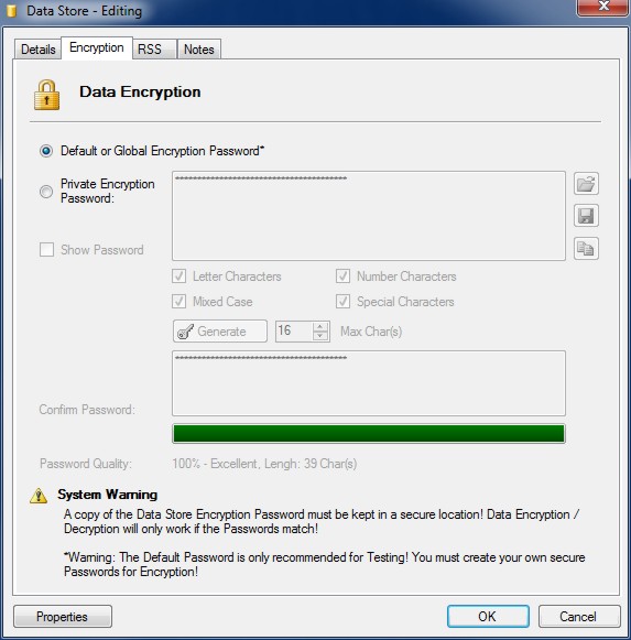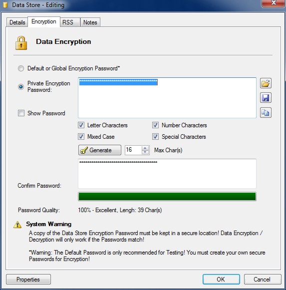 Great care must be taken to keep copies of encryption passwords in a secure location. If you lose your password you will not be able to decrypt your data. You must also remember what password you used to encrypt data if you decide to change the password at a later stage. Encryption / decryption will only work if the encryption passwords are the same.