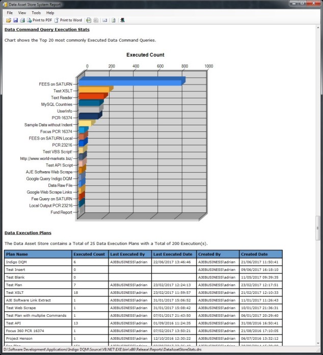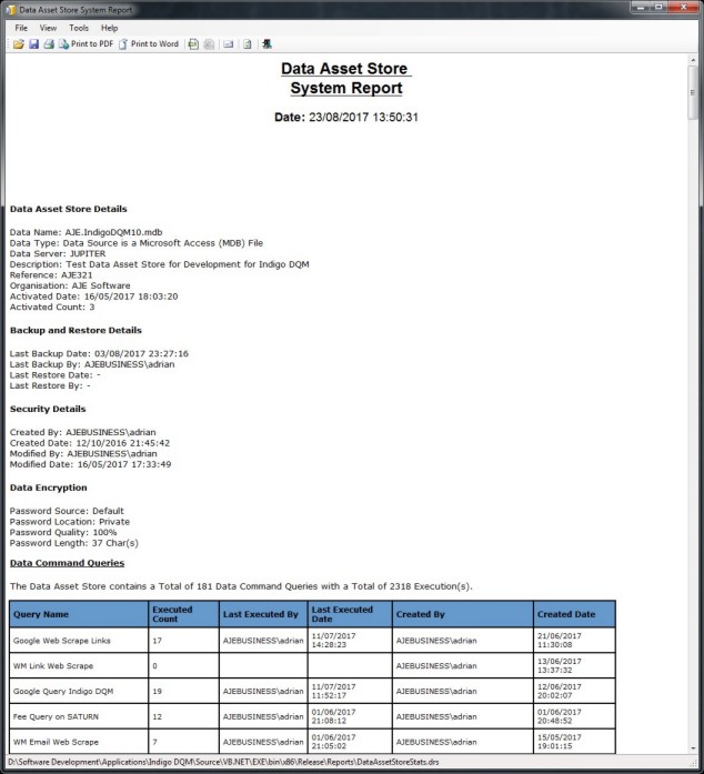 Indigo DQM Data Asset Store Report gives an overview of all the Data Assets contained within the Data Store including all the Data Command Queries, Data Sources, Data Reports and Data Execution Plans in the shared Data Asset Repository.