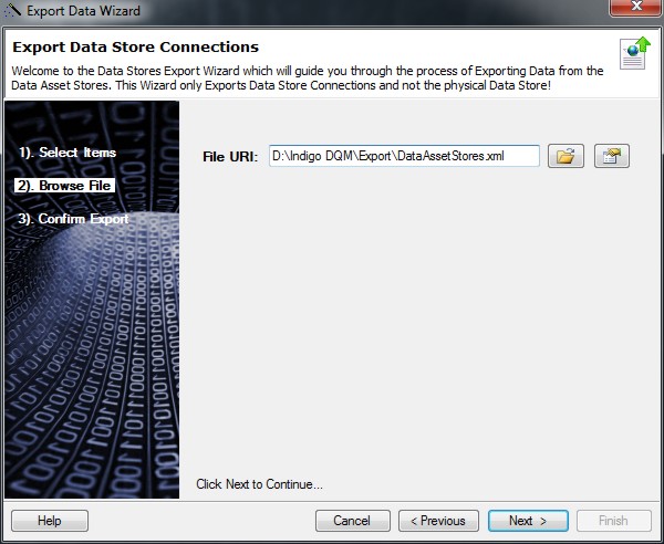 Indigo DQM Data Asset Store connections / links can be exported using the Export Wizard on the Data Asset Stores Tool.