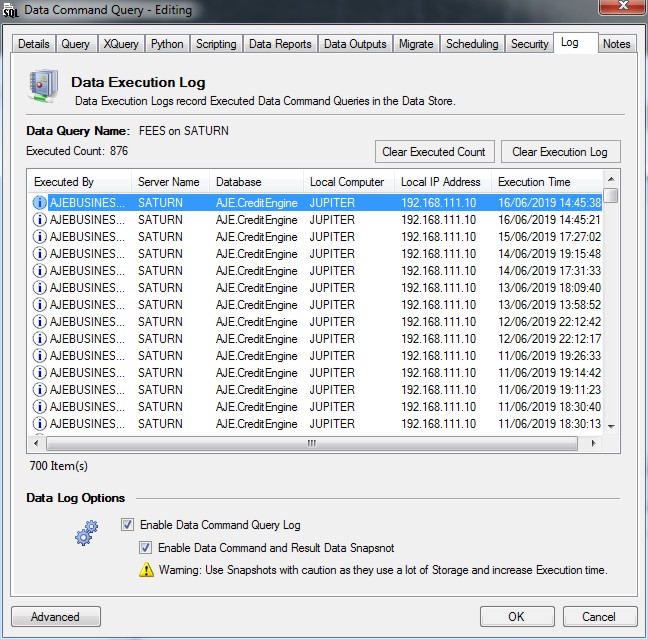 Indigo DQM Data Management System includes an Execution Log of all executed Data Command Queries.