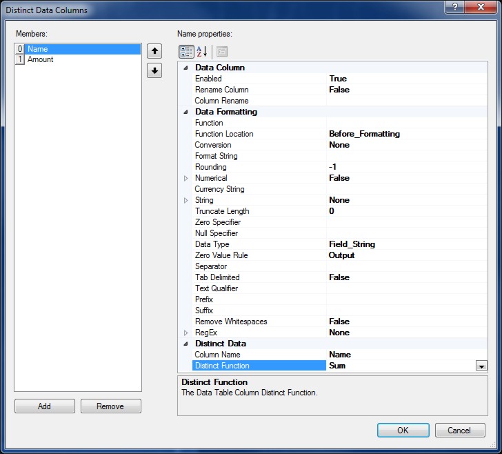 Data Distinct determines how data is summarized with special functions for summarising data by Sum, Average, Count, Max, Min, First, Last and Exists.