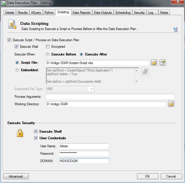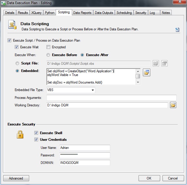 Indigo DQM's Data Management Engine (DME) can execute scripts on Data Execution Plans if additional processing is required.