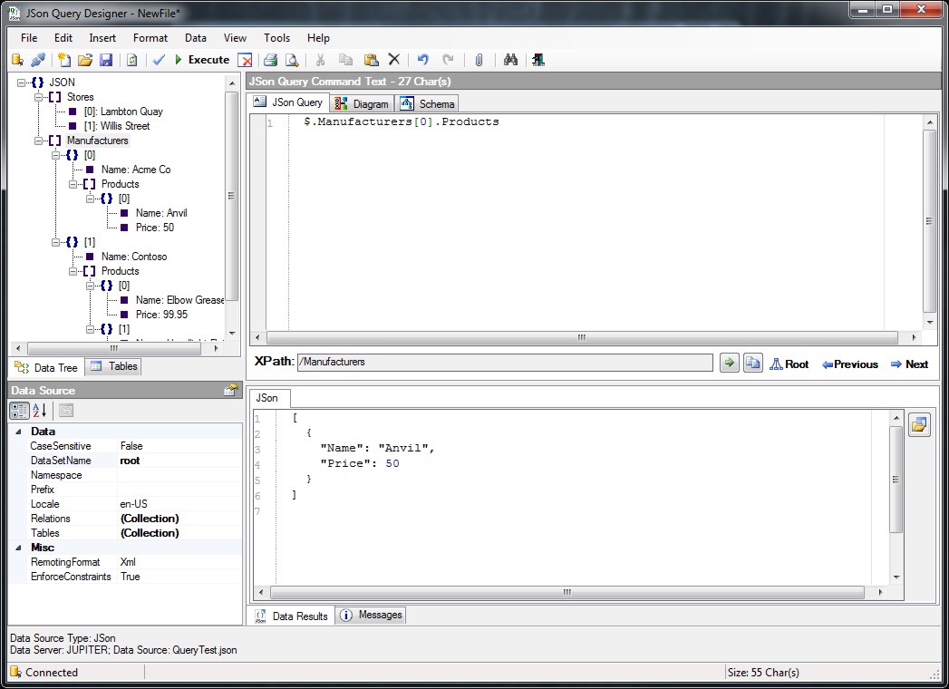 The JSon Query Designer allows complex JSon Queries to be executed against a JSon Data Source.