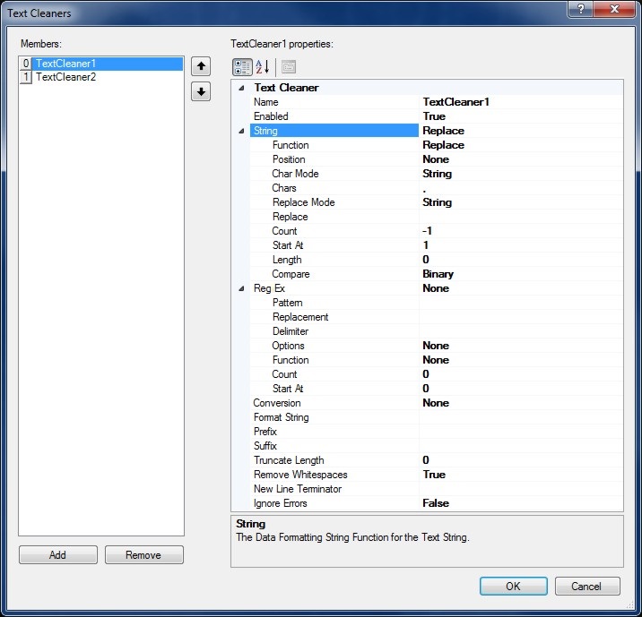 Text Cleaner members can be moved up and down using the arrow buttons to control the order in which they are applied.