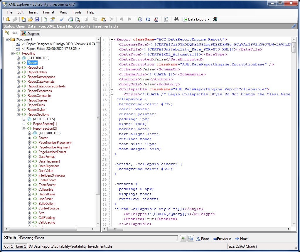 The XML Explorer Tree View is a visual representation of an XML document and allows navigation of the Data by expanding out elements and generating XPath expressions. XML Data for the Tree Node is shown in the XML Editor and can be updated.