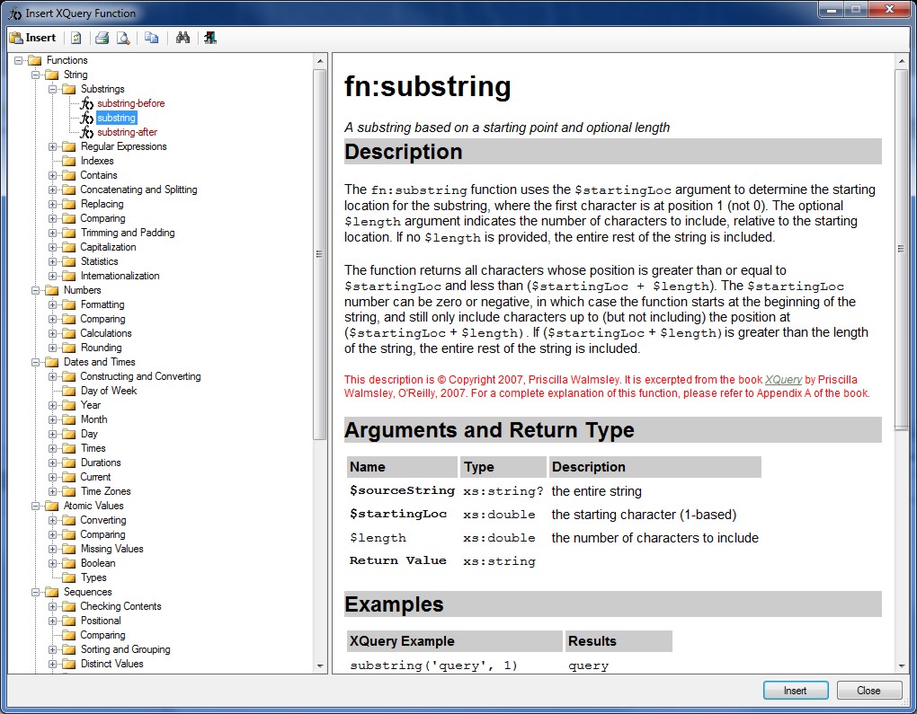 Select the category and function to insert into the XQuery and click OK or Insert.