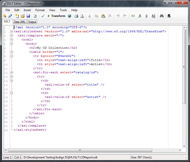 The XSLT Editor allows complex transformations to be validated and executed against XML data.