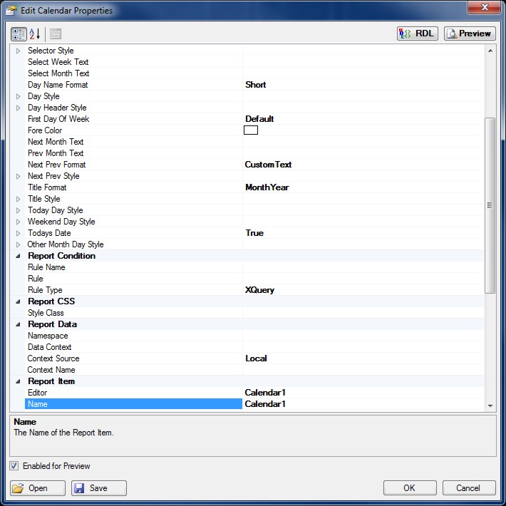 To add, edit or insert a Report Calendar click the Report Designer tree-view and select a Report Section or Report Group and then click the menu Edit | New, Insert or Edit Calendar.