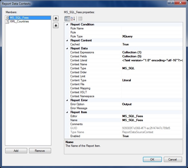 To add or edit a Report Data Context click the menu Data | Report Data Contexts or select the Data Contexts (...) collection button from the Report property page.