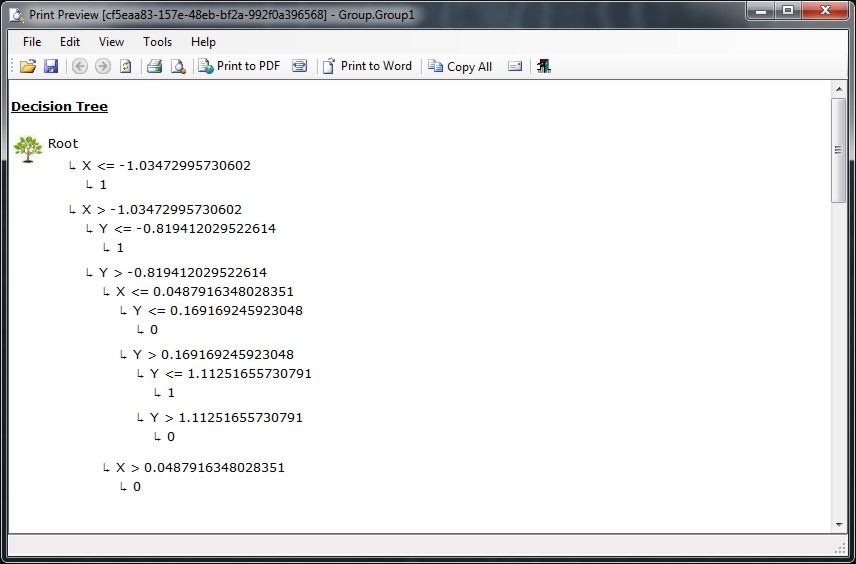 Report Data Tree showing a Decision Tree from an Artificial Intelligence / Machine Learning example.