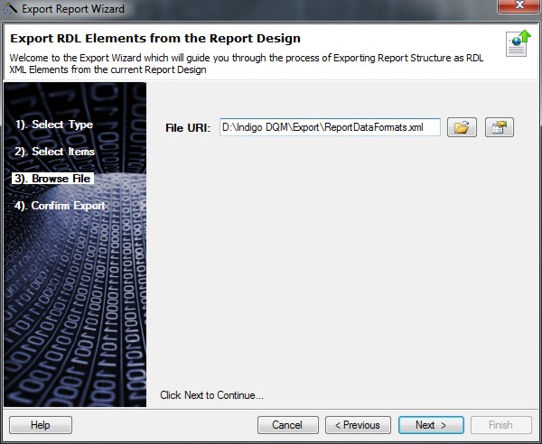 Indigo DRS can export and save Report elements using Indigo DRS RDL (Report Definition Language). Elements can be exported using the Export Wizard or saved from the RDL Editor / Viewer. Exported RDL will be saved with an XML File extension.