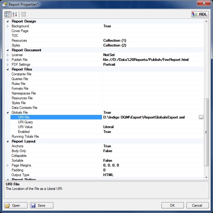 Click the Globals File (...) property button to specify the URI File or URI Query for shared Report Globals.