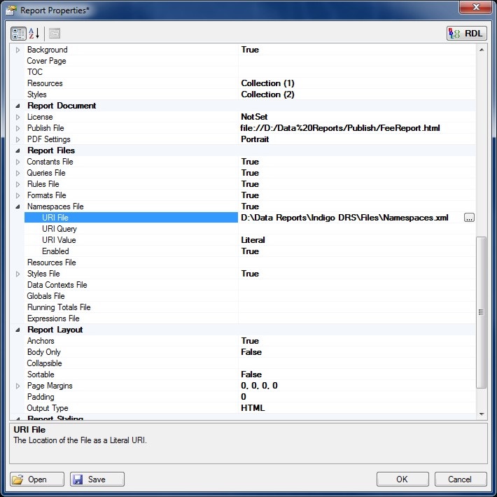 Click the Namespaces File (...) property button to specify the URI File or URI Query for shared Report Namespaces.