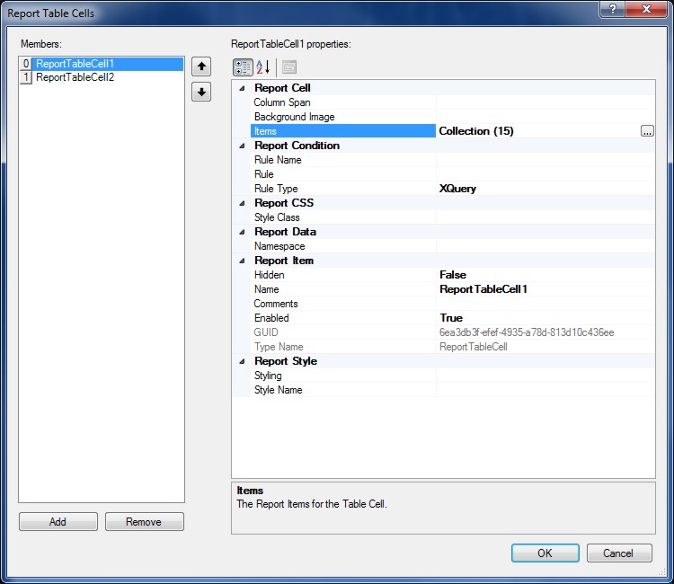 To add a Report Item to the Table Cell click the Items (...) collection button and then the arrow on the Add button on the Collection Editor and select the item to add to the Report Table Cell.