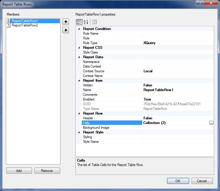 Enter the details for the Table Row along with any styling and conditional Report Rules. Add Columns / Cells to the Row by clicking the Columns Collection Editor.