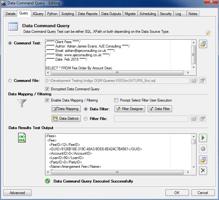 Click the 'Execute' button to apply the Data Filter and view the filtered Data. Click OK to apply the Data Filter to the Data Command Query.