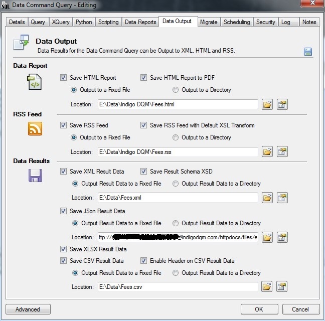 Indigo DQM's Data Management Engine (DME) can output and automatically save Data and Reports for Data Command Queries in various formats including HTML, PDF, RSS, XML, JSon, XLSX and CSV.