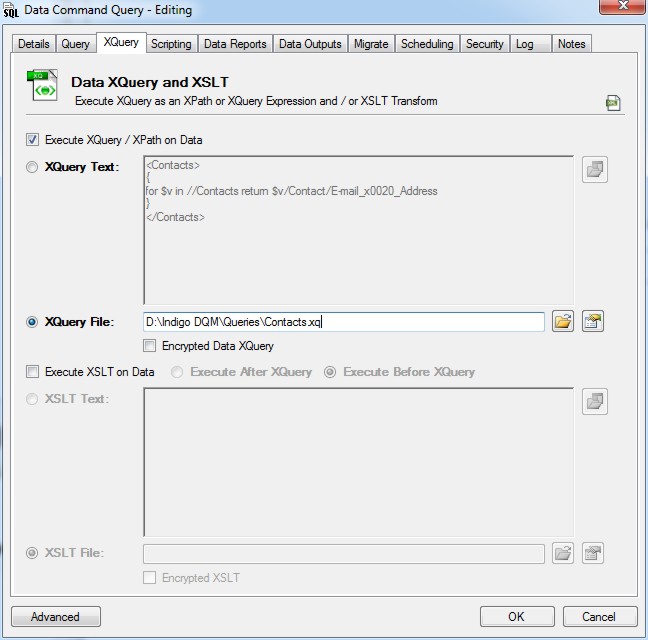 Indigo DQM's Data Management Engine (DME) can execute additional XQuery expressions and / or XSLT transforms on Data Command Queries if required.