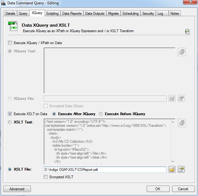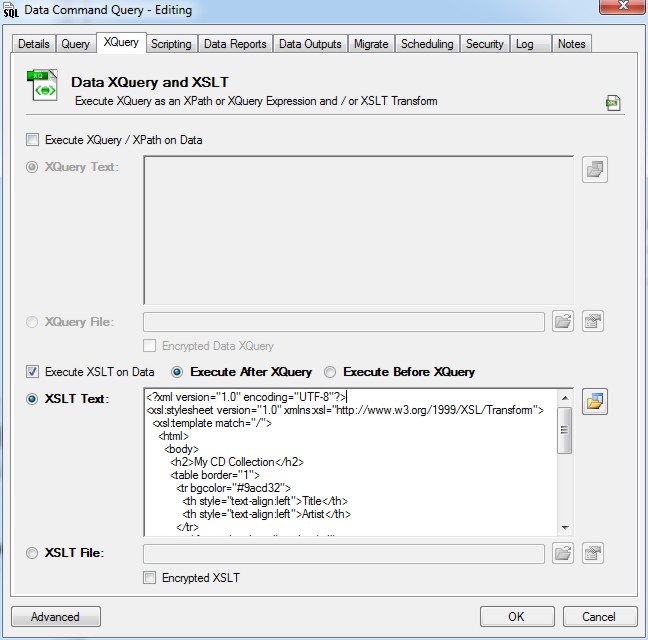 Check the option to enable the XQuery and enter the XQuery / XPath expression to execute on the Data Command.